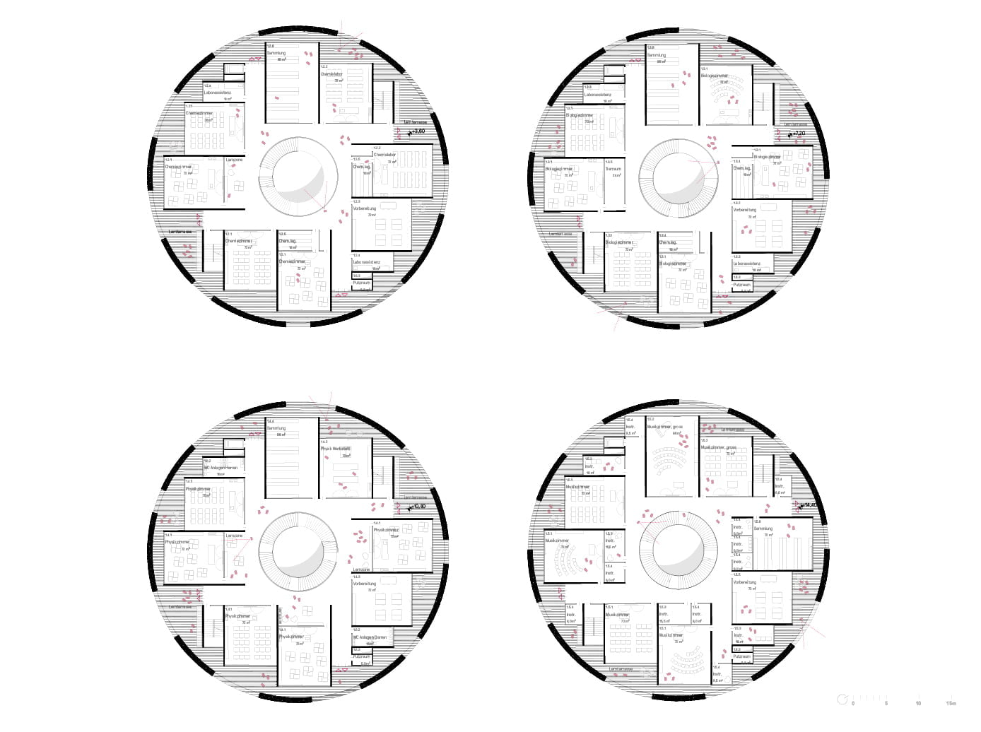 In einer städtebaulich heterogenen Körnung des Umfeldes bezieht der Projektansatz Haltung und vermittelt Einprägsamkeit im Sinne eines Quartierzentrums für alle. Der parkartige Charakter des bestehenden Schulgeländes wird durch die Setzung von – nach Funktionen gegliederten – Pavillons erhalten und unterstützt. Öffentlichkeit und Aufenthaltsqualität entsteht.